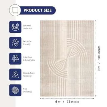 The rug measures 6’ x 9’, making it suitable for various spaces in your home, from living rooms to bedrooms.