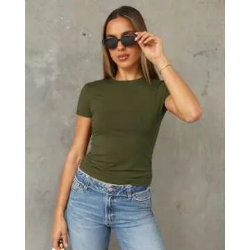 Show more Introducing the Abardsion Women's Casual Basic Going Out Crop Top, the perfect blend of style and comfort for the modern woman seeking both versatility and flair in her wardrobe. This slim-fit, short-sleeve crew neck t-shirt is designed to hug your curves in all the right ways, providing a flattering fit that feels like a second skin. Made from a high-quality, lightweight, and soft fabric, it ensures you stay comfortable whether you're lounging at home, heading to the office, or enjoying a night out. Available in a chic Army Green color, this t-shirt is a must-have staple for any fashion-forward individual. With its cropped length and sexy silhouette, this versatile piece can easily be dressed up or down, making it a favorite choice for countless occasions.