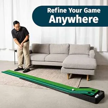 This indoor putting green is equipped with a smart ball return system, making it easier than ever to focus on your shots without the hassle of retrieving the ball. Simply putt and watch as the ball returns to you, allowing for uninterrupted practice sessions.