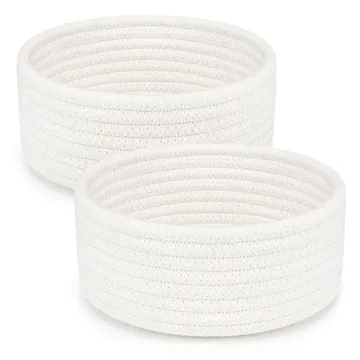Show moreIntroducing the ABenkle 2 Pack Small Baskets, the ideal blend of style and functionality for your organizing needs. Crafted from soft cotton rope, these mini tiny storage baskets are not just visually appealing but exceptionally durable. Measuring 7.08" x 7.08" x 3.15", they fit perfectly in bedroom nooks, living room shelves, and even on kitchen counters. The lovely white color provides a clean aesthetic that coordinates effortlessly with any decor—from boho chic to minimalist modern. With their versatile design, these baskets are perfect for decluttering your space or displaying decorative elements in a charming way.