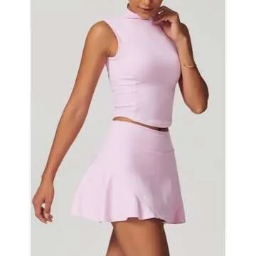 ABOCIW Tennis Skirt Sets Women 2 Piece Outfits High Waist Plested Mini Skirt Skorts Athletic Dress with Shorts Sleeveless High Neck Workout Crop Tank Top with Bra Golf Outfits Pink Small