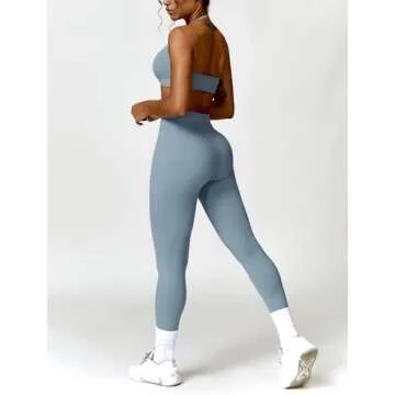 ABOCIW Workout Sets for Women 2 Piece Outfits Twist Waist High Waist Leggings with Pockets Halter Twist Front Sports Bra Gym Sets Twist Blue Gray X-Large