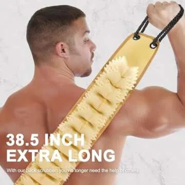 Show more Introducing the Abootoo Exfoliating Loofah Back Scrubber, the ultimate shower companion designed to transform your bathing experience into a luxurious spa-like retreat. Measuring a generous 38.5 inches, this long back scrubber is specifically crafted to help you effortlessly cleanse all those hard-to-reach areas of your back. No more awkward maneuvers or strained muscles! Made from high-quality plant fibers, this double-sided scrubber features a textured loofah side for rich lathering and a bumpy exfoliating surface that easily removes dirt and dead skin, leaving your skin feeling revitalized and radiant. Say goodbye to ordinary bath brushes and hello to a new level of cleanliness!