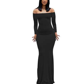 Show moreStep into elegance with the **ABYOVRT Women Off Shoulder Long Sleeve Bodycon Dress**, a stunning piece that effortlessly combines style with comfort. This sexy maxi bodycon dress is crafted from a premium blend of **95% polyester and 5% spandex**, ensuring a stretchy, breathable, and skin-friendly fit. With its fashionable off-the-shoulder design and flowing fishtail hem, it's perfect for showcasing your unique style and curves.