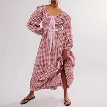 ABYOVRT Women Plaid Maxi Dress Long Puff Sleeve Square Neck Flowy Boho Dress Bow Tie Smocked Fall Dresses (Red a,M)