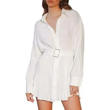 ABYOVRT Women Shirt Dresses Long Sleeve Pleated Mini Dress Casual Button Down Tunic Tops with Belt Vintage Streetwear (B-White,Small)