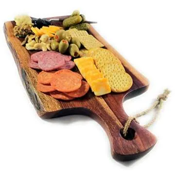 Acacia Charcuterie Board with Natural Live Edge & Handle - Wood Cheese Board - Decorative Wooden Serving & Cutting Board - Housewarming, Mothers Day, New Home & Wedding Gifts (18” x 8”)