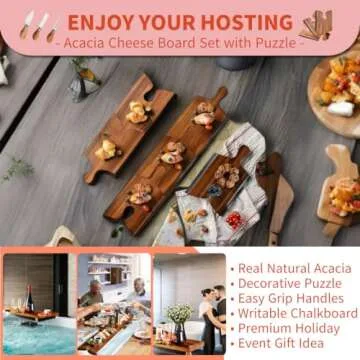 Unlike standard cheese boards, the Acacia Cheese Board stands out with its innovative puzzle design, enabling personalization through chalkboard edges and offering versatile usage in various settings. Competitively priced for the level of craftsmanship, this set outshines others in both functionality and aesthetic appeal, ensuring you have not just a serving solution, but an art piece.