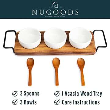 Acacia Wood Serving Tray with 3 Ceramic Bowls & 3 Wooden Spoons - Relish Tray with Stainless Steel Handles & Non-Scratch Rubber Feet Serves as Chip and Dip Serving Set for Sauces, Dips & Much More