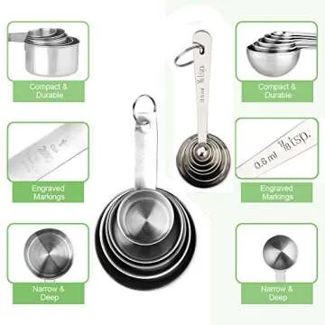 Show more The Accmor Stainless Steel Measuring Spoons and Cups Set is an indispensable kitchen companion for both aspiring chefs and seasoned professionals. Crafted from high-quality satin brushed stainless steel, this premium set not only guarantees exceptional durability but also brings an elegant aesthetic to your kitchen. With engraved markings that remain clear and legible, you can quickly and effortlessly measure various ingredients without the worry of fading marks. Designed thoughtfully for practical use, this set covers all your measuring needs, ranging from convenient 1/8 tsp to 1 cup, ensuring every recipe comes out just right.