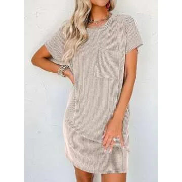 Show more Introducing the **Acelitt Women Casual Summer Dresses 2025 Fashion Crewneck Short Sleeve Trendy Loose Vacation Beach Ribbed Shift T-shirt Mini Dress**! Perfectly designed for the modern woman, this dress embodies the essence of summer fashion with its comfortable crewneck design and relaxed fit. The short sleeves and loose silhouette not only provide ease of movement but also make this dress a stylish choice for the 2024 summer season. Crafted from breathable materials, it ensures you stay cool and at ease, whether you're at the beach or enjoying a picnic in the park. With a fashionable ribbed texture adorned with trendy striped patterns, this mini dress is bound to become your go-to summer staple.