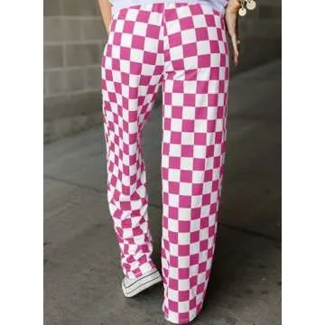 Acelitt Women's Casual Checkered Pants 2025 Spring Summer Lightweight Elastic Waist Comfy Loose Wide Leg Plaid Beach Pants Trousers Vacation Outfits Pink Medium