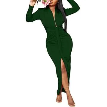 With a long sleeve design perfect for cooler seasons, this ruched bodycon pencil dress also boasts a tasteful front slit to showcase your legs with a hint of sexiness. Whether you're headed to a cocktail party, a wedding, or a night out with friends, this classy solid color dress is versatile enough to fit a myriad of occasions while maintaining an air of sophistication.