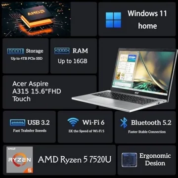 acer Aspire A315 15.6" Full HD IPS Display Touch Business Laptop AMD Ryzen 5 (Up to 4.3 GHz), 16GB RAM, 1TB SSD, WiFi, HDMI, Bluetooth, USB-C, Windows 11 Home (Renewed)