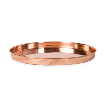 Show moreIntroducing the Achla Designs Round Tray, a stunning blend of functionality and aesthetics that elevates your home decor game effortlessly. Measuring at a convenient 12 inches in diameter and one inch high, this round copper tray is exquisitely designed with straight sides and a simple rolled edge that offers both versatility and a classic touch to any setting. Handcrafted from sturdy stainless steel and plated with rich copper, this piece not only radiates sophistication but will also develop a natural patina over time, giving it a stylish rustic charm that only enhances with age.