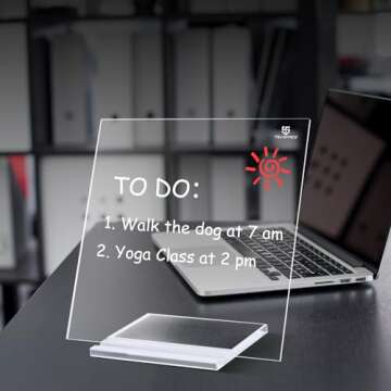 Show moreEnhance your workspace with the Acrylic Dry Erase White Board, a stylish and multifunctional tool designed to boost productivity while adding a touch of elegance to your home office or commercial environment. Measuring 10 x 10 inches, this clear desktop whiteboard features a frameless design that seamlessly integrates into any decor. Crafted from durable acrylic, it is engineered for heavy writing use, making it an ideal companion whether you’re drafting ideas, jotting down reminders, or crafting positive affirmations. Its sturdy, folding support not only ensures stability but also makes it incredibly easy to transport, allowing you to take it from your office to your home with ease.
