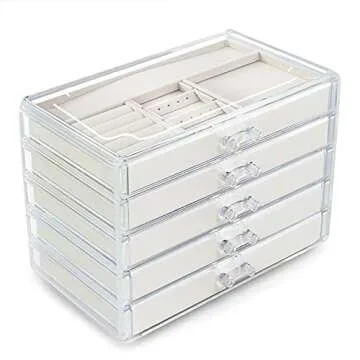 Acrylic Jewelry Organizer with 5 Drawers, Large Clear Jewelry Boxes for Women Gifts, Velvet jewlwey organizer container, Jewlery storage cases holders for necklaces earrings rings bracelets - Beige