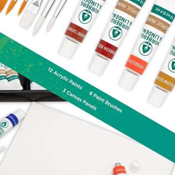 Acrylic Paint Set - 12 Acrylic Paints, 6 Brushes & 3 Canvas Panels for Premium Creativity