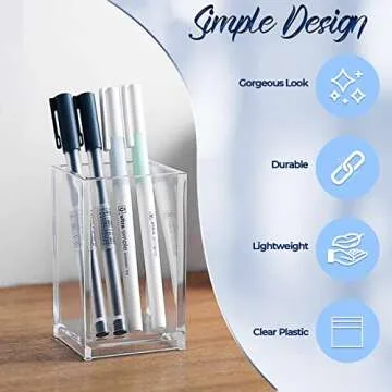 Show more Transform your workspace into a beacon of organization and elegance with our exquisite range of clear acrylic holders and organizers. Designed for practicality and aesthetics, these essential desk accessories include everything from pen holders to makeup brush cups. Made from premium quality acrylic, they seamlessly blend durability with sophistication, ensuring that your workspace not only remains clutter-free but also looks stylish. Measuring 2.6x2.6x4 inches for the acrylic holders, they are perfectly sized to fit essential items without occupying too much space on your desk.