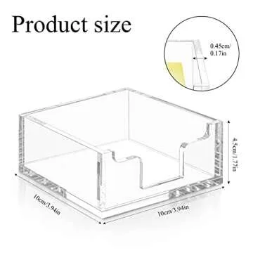 Show more The clear desk notepad holder is a perfect blend of functionality and aesthetic appeal. Crafted from sturdy acrylic, this holder not only organizes your sticky notes but also adds a touch of modern elegance to your workspace. Its transparent design ensures that your notes are always visible yet discreetly stored, allowing you to keep track of your supplies effortlessly. Measuring approximately 3.9 x 3.9 x 1.8 inches, it is designed to accommodate most standard sticky note sizes without overwhelming your desk space. Whether you have a home office or a corporate cubicle, this holder complements various decor styles, enhancing the overall ambiance.