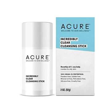 Show more Transform your skincare routine with the Acure Organics Incredibly Clear Cleansing Stick. This innovative cleansing solution is designed specifically for combination to oily skin, featuring the powerful benefits of Rosehip Oil and Sea Kelp to cleanse, purify, and nourish your complexion. This pack of 2 ensures you’re always stocked up on this incredible formula, providing a deep-clean without stripping your skin of its natural moisture. The convenient stick format allows for easy application on-the-go—just glide it over your face, dampen with water, and you’re set!