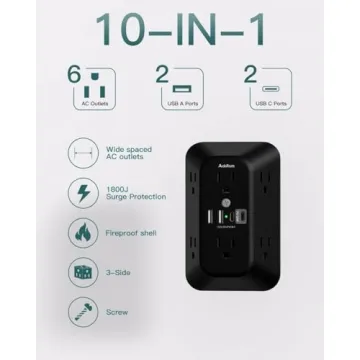 Show more Introducing the Addtam Surge Protector Outlet Extender – your ultimate solution for keeping all your devices powered without the clutter of traditional power strips. This ingenious product merges functionality and style, allowing for a streamlined experience in any setting, be it your home office, dorm room, or bedroom. With a stunning layout that includes 6 AC outlets and 4 USB ports (including 2 USB-C), you can easily charge multiple devices simultaneously. The thoughtfully designed side outlets ensure that larger power blocks can fit without blocking adjacent sockets, making it a true hero for power-hungry households.