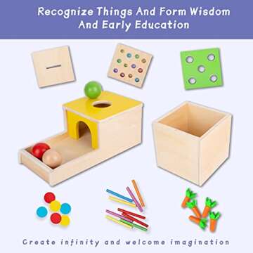 Show more Introducing the remarkable Adena Montessori 4-in-1 Wooden Toy Kit, designed to entertain and educate your little ones while promoting essential early development skills. This exceptional toy set combines an Object Permanence Box, Matchstick Color Drop Game, Carrot Harvest Game, and Coin Box, providing a diverse array of play experiences suitable for children aged 1-3 years. Each game challenges their cognitive abilities and fine motor skills, ensuring that every play session is not only enjoyable but educational.