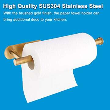 Adhesive Paper Towel Holder - No Drilling Under Cabinet Paper Towel Rack for Kitchen, SUS304 Brushed Stainless Steel, 12 Inch Bar - Fits All Roll Sizes (Gold)