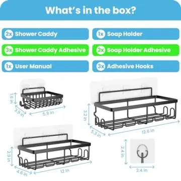 Adhesive Shower Shelves 3-Pack, Black Stainless Steel Shower Organizer with 20 Hooks, No-Drill, Easy Installation