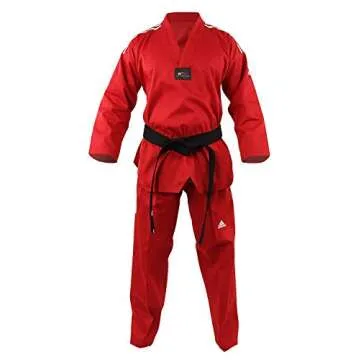 Introducing the adidas Champion 3 WTF Approved Color Taekwondo Uniform in striking RED, size 140 (0). This premium quality taekwondo uniform is designed for both functionality and style, making it an essential choice for practitioners looking to showcase their skills in competitions and exhibitions. The uniform features a comfortable v-neck jacket and elastic waist pants that ensure a snug fit, allowing for ease of movement during intense training or sparring...