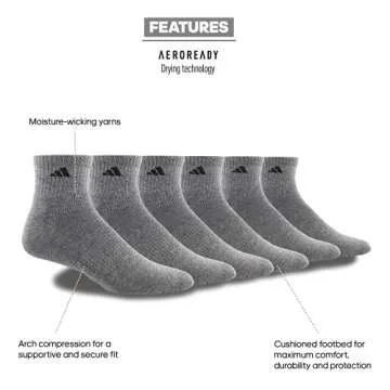 Show more The Adidas Men's Athletic Cushioned Quarter Socks with Arch Compression are engineered to elevate your athletic performance while providing maximum comfort and support. Crafted with advanced features tailored for active lifestyles, these socks are your perfect partner in sports and fitness activities. Sporting ample cushioning in key areas, these socks effectively absorb impact, making each stride feel effortless and helping to prevent foot fatigue. The unique blend of materials not only ensures durability but also a snug fit, thanks to the built-in arch compression, which stabilizes your foot’s natural structure and promotes optimal blood circulation.