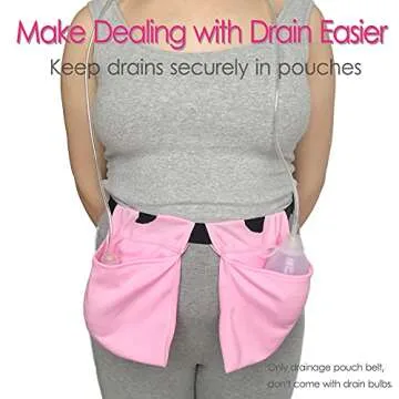 The adjustable drain holder features a stretchy, adjustable waist belt and two pockets designed to securely hold drainage bulbs. You can easily slide the pouches side to side for comfort.