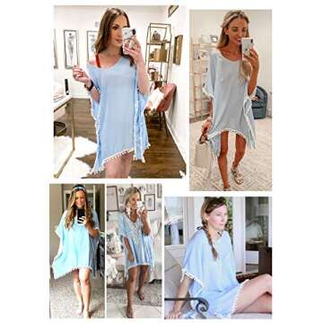 Adreamly Women's Pom Pom Trim Kaftan Chiffon Swimwear Bathing Suit Beach Cover Up Sky Blue Medium