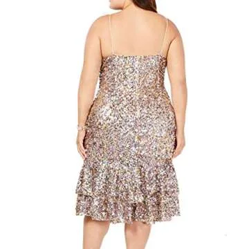 The Adrianna Papell Women's Plus Sequined Cocktail Midi Dress is available in various plus sizes to ensure a comfortable fit for curvy women.