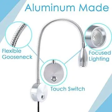 Adust Reading Light for Bed Headboard, Reading Lamp, Bedside Wall Mounted Reading Light, Headboard Lamp, 3W LED Touch Dimmable, 3 Color Temperature, 3000k, 4000k, 6000k