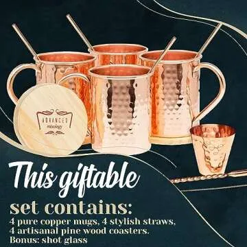 Advanced Mixology [Gift Set] Moscow Mule Mugs - 100% Pure Copper Mugs, 16 Ounce Set of 4 Stylish Designed Mugs with 4 Artisan Hand Crafted Wooden Coasters