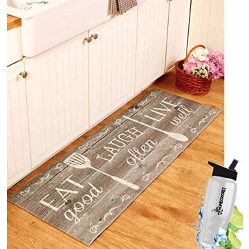 Show more Introducing the Aeiniwer TOMENGBEIAABBCC Gift Included - 55" PVC Kitchen Cushion Floor Runner by Home Cricket, a delightful addition that effortlessly combines style, comfort, and functionality for your kitchen space. This stunning decorative rug is designed with a unique "Eat Laugh Live" motif, bringing a touch of warmth and cheer to any culinary environment. Measuring at a generous 55 inches, it provides ample coverage for your kitchen area, whether in front of the sink, stove, or prep area. Made from high-quality PVC, this cushion floor runner is not only visually appealing but also engineered to provide superior comfort while standing, perfect for long cooking sessions. Plus, it includes a free bonus water bottle, allowing you to stay hydrated as you whip up delicious meals!
