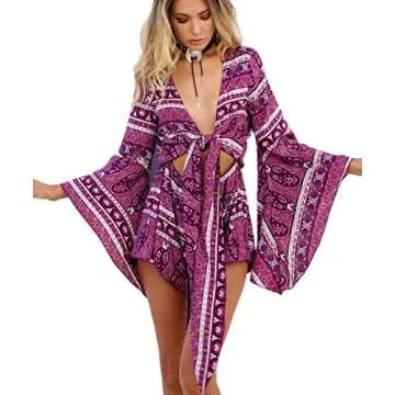 AELSON Women's Boho V Neck Print Romper Playsuit with Long Flare Sleeves