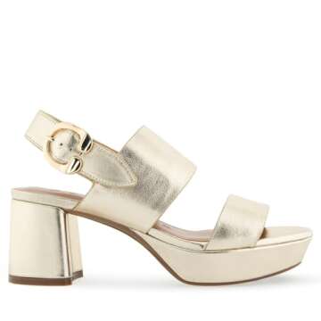Show moreStep into a world of sophistication and style with the AEROSOLES Women's Camera Platform Heeled Sandal. Crafted with care, this exquisite footwear melds both contemporary fashion and classic design elements, making it the perfect choice for any occasion. The shimmering gold metallic leather not only catches the eye but also adds a luxurious finish to any outfit. The adjustable buckled strap ensures a personalized fit, while the platform design offers exceptional comfort without sacrificing height, making these sandals an essential addition to your summer wardrobe.