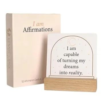 Show more Elevate your daily routine with our Affirmation Cards for Women, a thoughtfully curated deck of 52 "I Am" positive affirmation cards designed to inspire, uplift, and motivate. Each beautifully crafted card features soothing colors and empowering statements, making them perfect for anyone looking to cultivate positivity and mindfulness in their life. This elegant set not only serves as a daily ritual but also adds a touch of tranquility and beauty to any space. With the included wooden stand, you can effortlessly display your favorite affirmations on your desk or nightstand, creating a personal sanctuary of positivity.