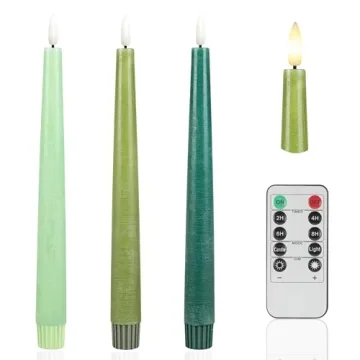 Show moreTransform any space into a serene sanctuary with the **AFINETH Green Flameless Taper Candles**, beautifully crafted with a stunning gradient color theme in three elegant shades of green. These 9.6-inch tall taper candles are made of real wax to provide that authentic candle-like feel while ensuring enhanced safety and convenience. Featuring an incredibly realistic 3D flame design that flickers like a genuine candle, they create the perfect romantic ambiance—ideal for cozy evenings at home, events, or festive celebrations.