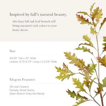 Show moreTransform your home with the stunning Afloral Summer Oak Leaf Branch, a leading choice in the world of realistic artificial flowers. Designed for those who value aesthetics and ease, this faux oak leaf branch adds an elegant touch to any space. The combination of green leaves accented with muted orange and rust red hues captures the essence of nature while remaining maintenance-free, letting you enjoy the beauty of plants year-round. Measuring an impressive 43.25 inches tall and 22 inches wide, it serves as a striking centerpiece perfect for vases, tables, or standalone displays. Every detail, from the vibrantly colored leaves to the expertly crafted stems, is designed to look undeniably lifelike, enriching your decor without the hassle of upkeep.