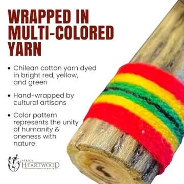 Show more Discover the enchanting sound and vibrant artistry of the Africa Heartwood Project 30" Cactus Rainstick—a unique musical instrument handcrafted in Chile. Each rainstick is meticulously crafted by native artisans using the naturally grown Copado cactus, ensuring a product that not only delivers exceptional musical quality but also reflects the rich cultural heritage of South America. The design features a wrapping of brightly dyed rasta-colored yarn, adding a visually stunning element that complements its functional appeal. With a length of 30 inches, this rainstick is designed to produce captivating rainfall sounds that can transport listeners to serene natural environments.