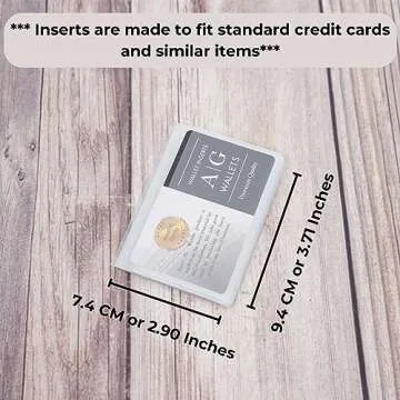 Show moreExperience the ultimate versatility and functionality with the AG Wallets Set of 2 Clear Premium Quality Wallet Inserts. Crafted from heavy-duty vinyl material, these inserts are recommended for trifold wallets yet versatile enough to fit bifold wallets as well. Each insert is designed to perfectly hold up to 6 cards, photos, IDs, and other similar accessories, making your wallet organization effortless and efficient. Measuring approximately 3.71" x 2.90" (9.4 CM x 7.4 CM), these inserts ensure a snug fit without wasting space, enhancing your wallet’s functionality while keeping everything accessible when you need it.