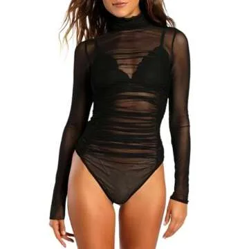 Show moreIntroducing the AGECODE Women's Mock Turtle Neck Sexy Ruched Sheer Mesh Long Sleeve Bodysuit in classic black, a captivating addition to your wardrobe that's designed to impress. Crafted from a luxurious blend of polyester and spandex, this unique bodysuit combines comfort and style to create a stunning silhouette. Its soft and stretchy fabric ensures a comfortable fit, flattering your figure while providing effortless movement. The turtleneck design and long spaghetti sleeves add a touch of elegance, making it perfect for layering or wearing solo.
