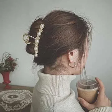 Agirlvct HAIR CLIP, 4.3inch Gold Hair Clips with Pearl and Rhinestone, Strong Hold Hair Jaw Clips for Women Girls Long Thick Hair (3 Pack)