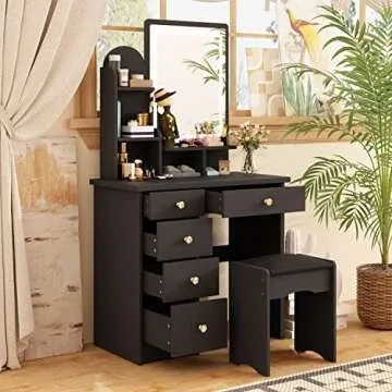 Show more If you're searching for the perfect blend of beauty, function, and style, look no further than the AGOTENI Black Vanity Set with Mirror. This exquisite makeup vanity set is designed to cater to all your cosmetic storage needs, featuring a remarkable combination of 5 spacious drawers and 3 side shelves that promise to keep your makeup and beauty accessories organized and within easy reach. The large storage space makes it effortless to arrange all your essentials, ensuring you can find everything you need when getting ready for your day or a special night out.