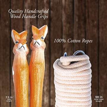 Show moreIntroducing the **aGreatLife Jump Rope for Kids**, a delightful fusion of artistry and play, making fitness for children both engaging and enjoyable. This beautifully crafted jump rope features unique hand-carved wooden bunny handles, adding a charming touch reminiscent of playful childhood days. These handles are not just visually appealing but also ergonomically designed for a comfortable grip, making it easy for kids to jump, skip, and exercise without discomfort. The rope itself is made from high-quality cotton, ensuring it's lightweight, tangle-free, and easy to adjust to any desired length. Unlike conventional weighted jump ropes, this design allows children to enjoy jumping without feeling weighed down. Perfect as a gift, it comes beautifully packaged without plastic, complementing the eco-conscious values of parents and guardians alike.