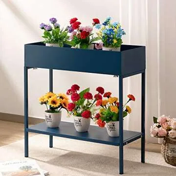 Show more Discover the charm of the AGTEK 2-Tier Garden Planter Flower Box Stand, expertly crafted to enhance the beauty of your home or garden. This stylish planter features elegant white ceramic pots set against a stunning navy blue iron frame. Measuring 23.62"L x 10"W x 24.4"H, it's an ideal addition for those with limited space, whether it’s a cozy balcony or a sun-splashed patio. Enjoy the delightful blend of aesthetics and functionality as you showcase your plant collection.