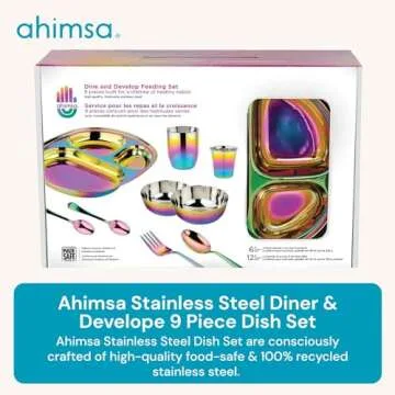 Ahimsa Stainless Steel Dine & Develop 9 Piece Dish Set | Divided Plate + 8 Ounce Cup + 4 Ounce Cup + 8 Ounce Bowl + Fork + Spoon + 2 Baby Spoons | Toddler Dishware | 100% BPA Free (Rainbow)